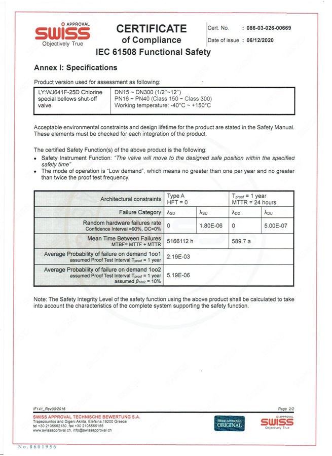 SIL認(rèn)證證書(shū)-液氯專(zhuān)用波紋管切斷閥2